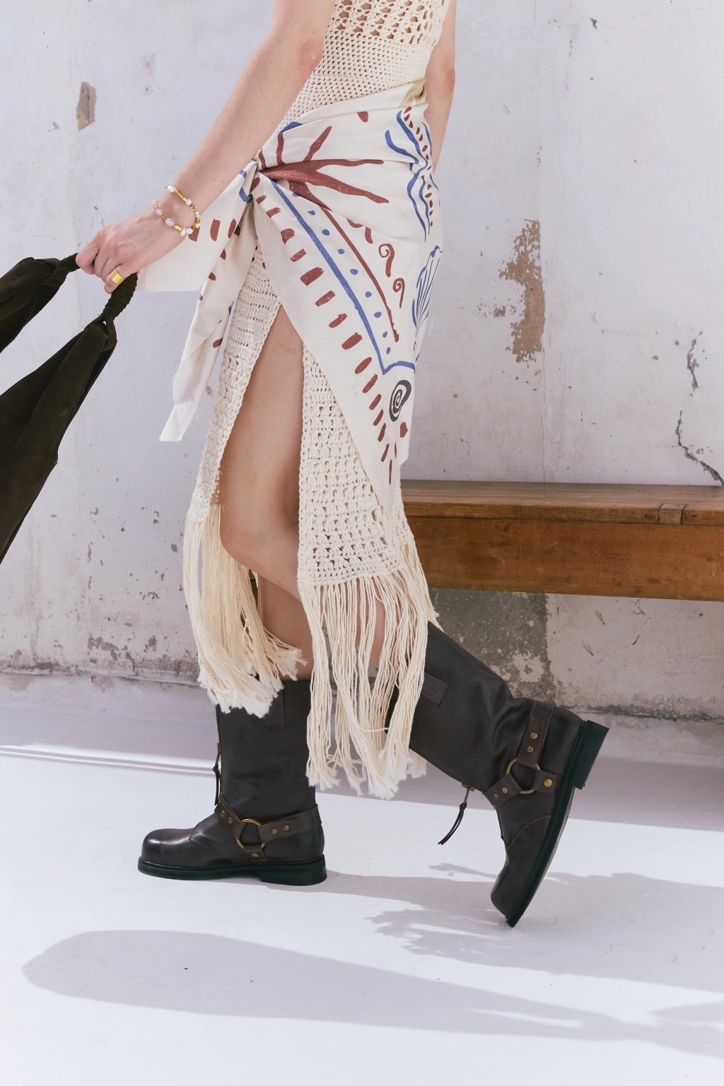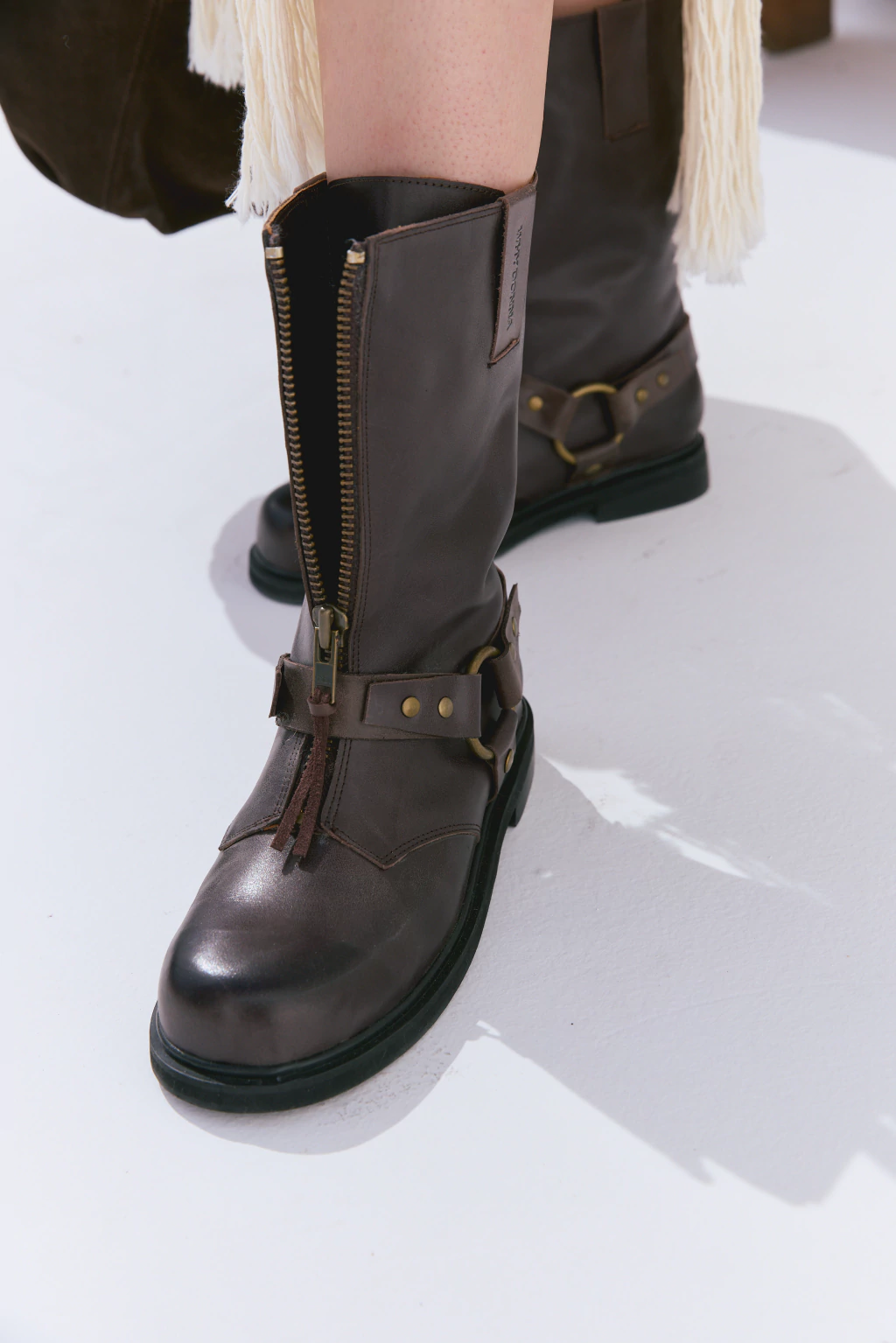 Bota de punta redonda, con cierre frontal expuesto. Tiene detalle de herrajes en bronce viejo y estribo. Esta realizada en cuero, y forrada en forrería vacuna. Su taco mide 3 cm y el fondo es artesanal de suela.