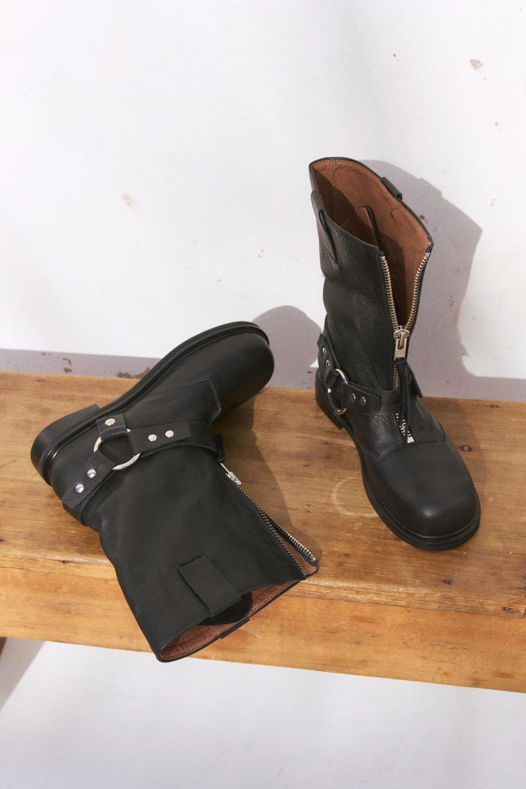 Bota de punta redonda, con cierre frontal expuesto. Tiene detalle de herrajes niquel y estribo. Esta realizada en cuero, y forrada en forrería vacuna. Su taco mide 3 cm y el fondo es artesanal de suela.