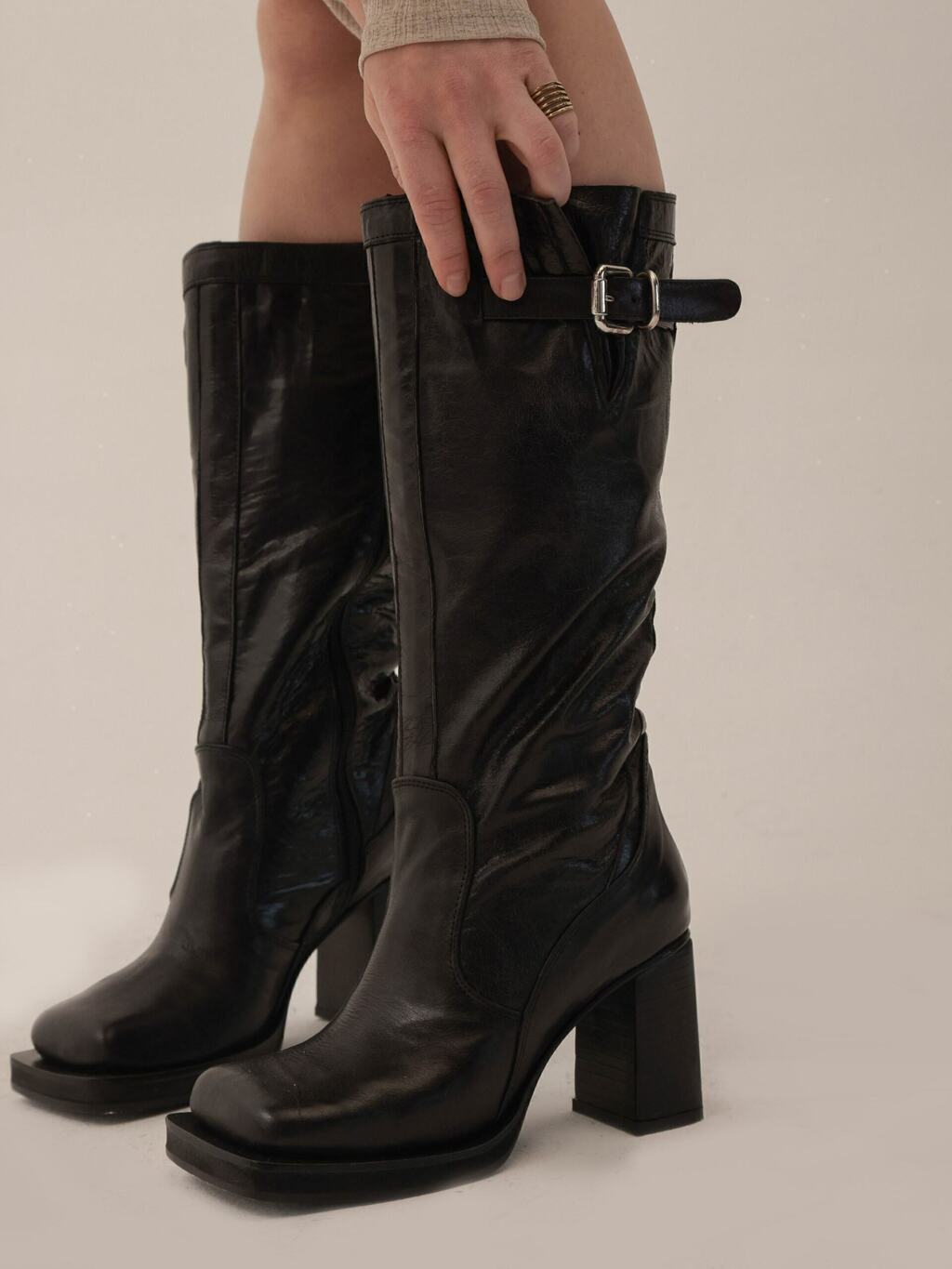Bota de caña alta realizada en cuero semibrilloso, con detalle de punta cuadrada, recortes y tira con hebilla. El interior esta forrado en forreria vacuna. El fondo es de madera color negro.