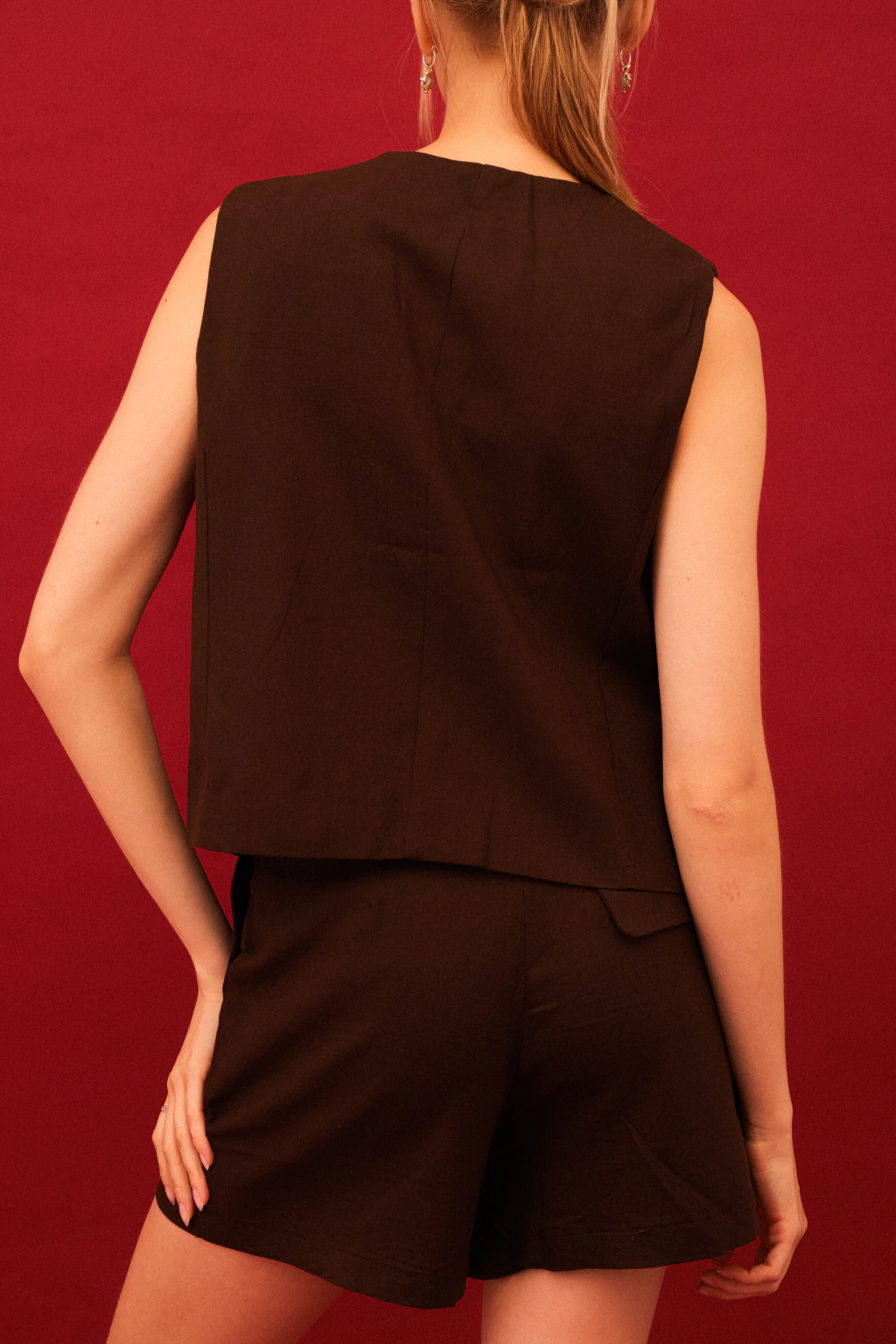 Chaleco oversized confeccionado con lino. Pinzas y bolsillos no funcionales en el delantero. Combinalo con el short.