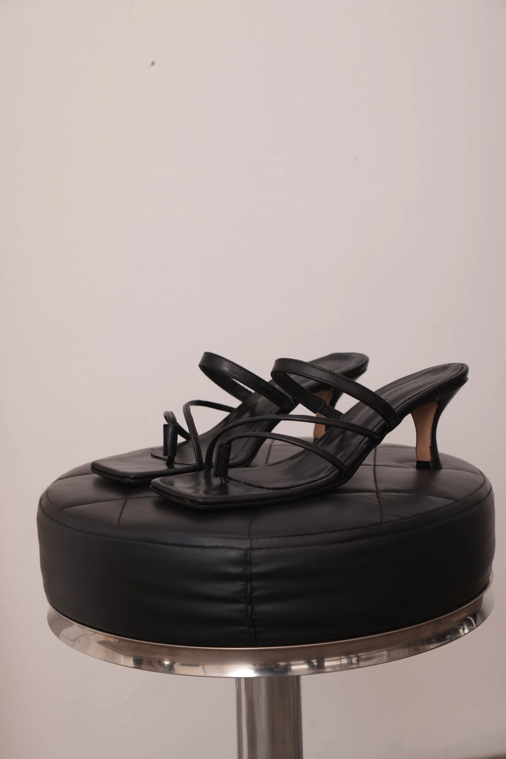 Sandalia realizada en cuero negro semi brilloso con tiritas y taco chupete.