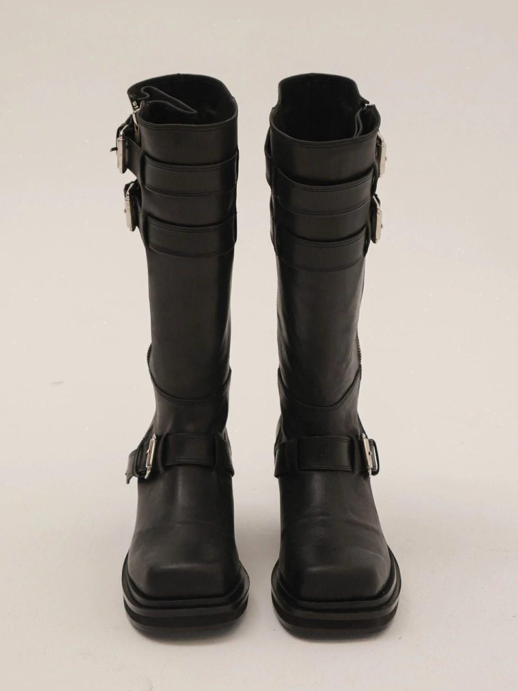 Bota de caña alta y punta cuadrada, con detalle de cierre metalico lateral, y tiras con hebillas. El interior esta forrado en forreria vacuna. Tiene un fondo de doble vira, de madera, super comodo.